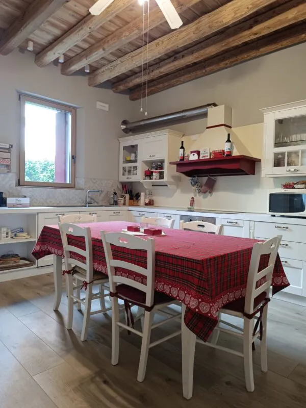 La barchessa dispone di quattro camere matrimoniali, tre bagni, una cucina completamente attrezzata e un salotto pensato per momenti di relax e convivialità. Un suggestivo soppalco ospita inoltre un divano letto con due posti aggiuntivi, ideale per accogliere famiglie o piccoli gruppi in un contesto riservato ed elegante.
